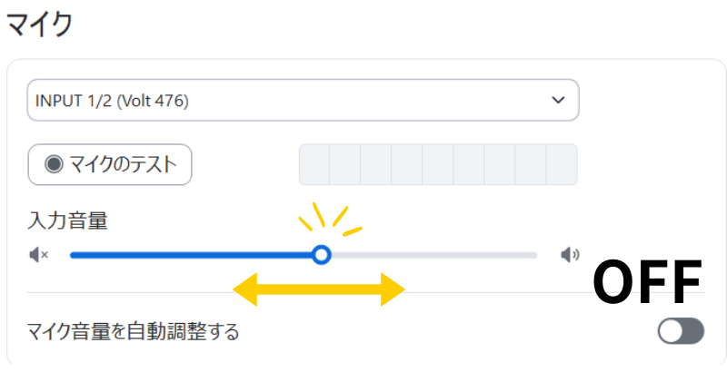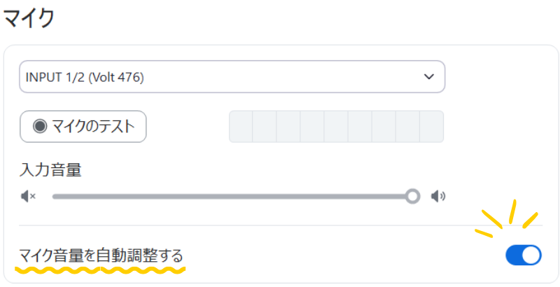 音が割れるのは、マイクに入る音量が基準値を超えてしまっているからです。まずはマイクの「インプット」を確認しましょう。確認の仕方は次の通りです。