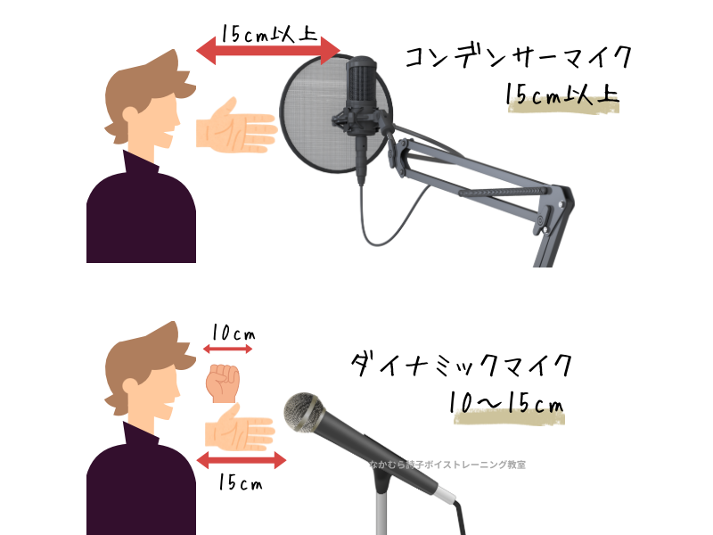 通常、ダイナミックマイクで10~15cm、コンデンサーマイクで15cm以上あるとよいと言われています。
