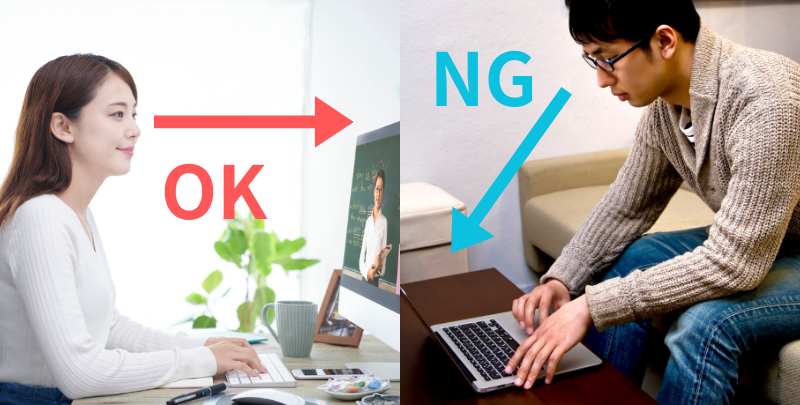 まずは、部屋の内外の雑音が、自分のマイクに入らない工夫をしましょう。家族の声、テレビの音、近所の工事音。他にも、声がワンワン反響する風呂場、廊下での受講は控えるようにします。