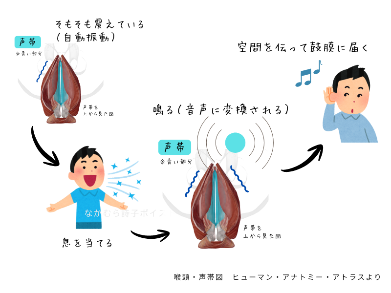 声帯は自動振動といって、息を当てなくても勝手に振動しています。