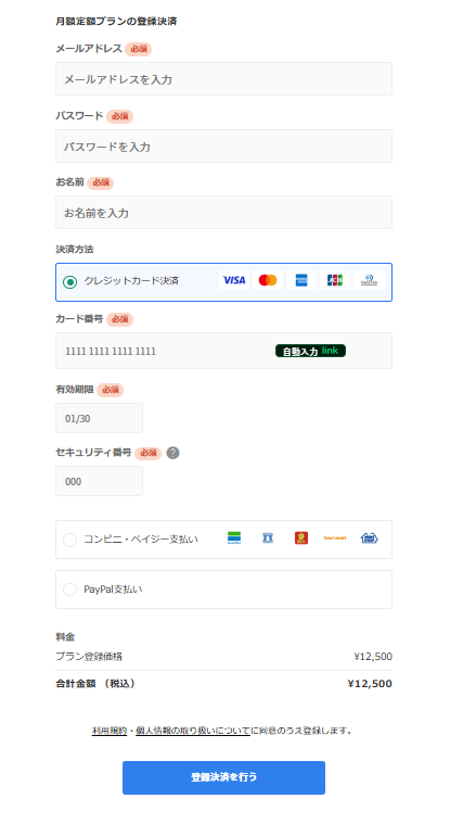 必要事項を入力し、「登録決済を行う」を押して料金をお支払いください。
