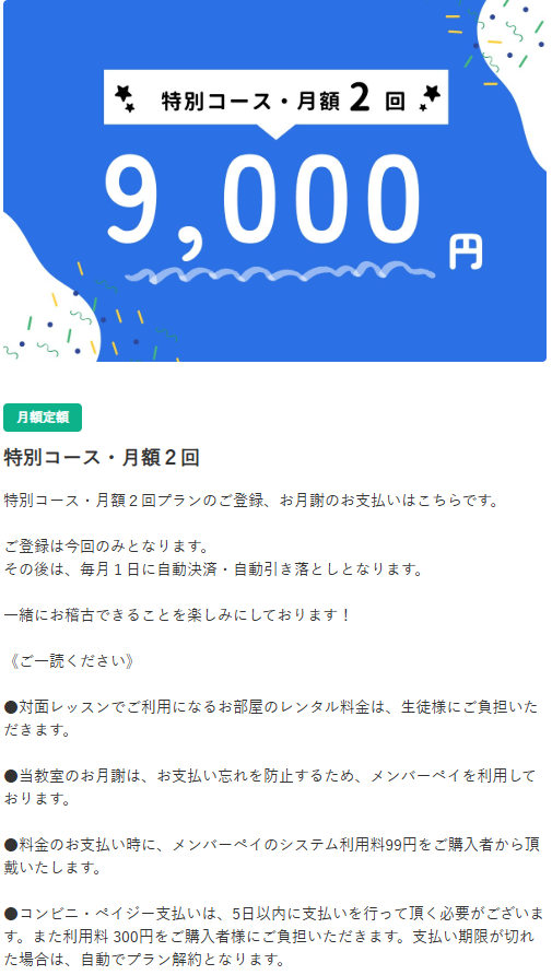 - 一般コース・特別コースは、メンバーペイへのご登録は最初の1回のみです。それ以降は、毎月1日に自動更新&自動決済となります。